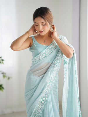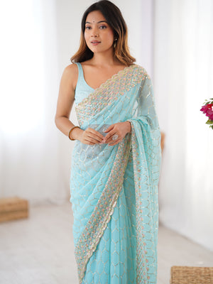 Sky Blue Georgette Sequins Embroidery Work With Cut Work Border Saree With Blouse Piece