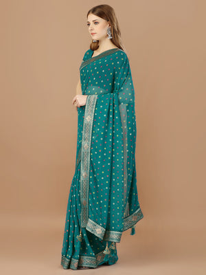 Jacquard designs makes Georgette sarees attractive. Jacquard designs are a product of incredible hard work of designers as they are highly intricate and detailed. That’s perhaps why women love to adorn this beautiful saree for various occasions.